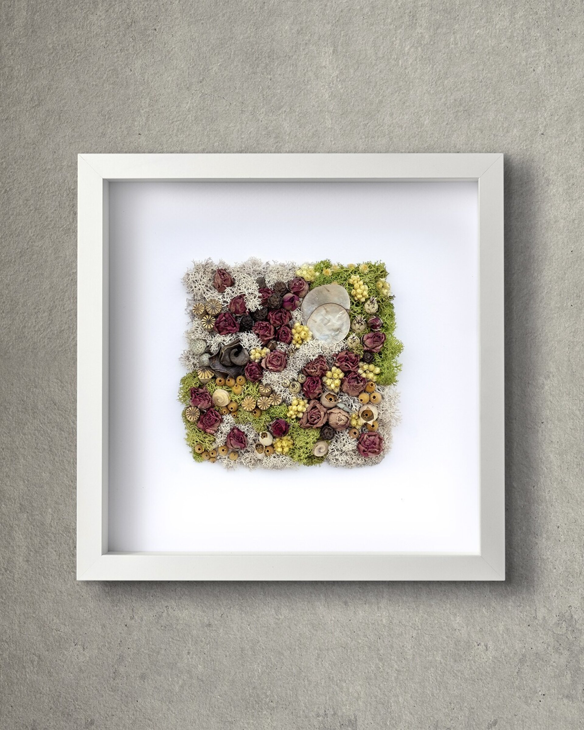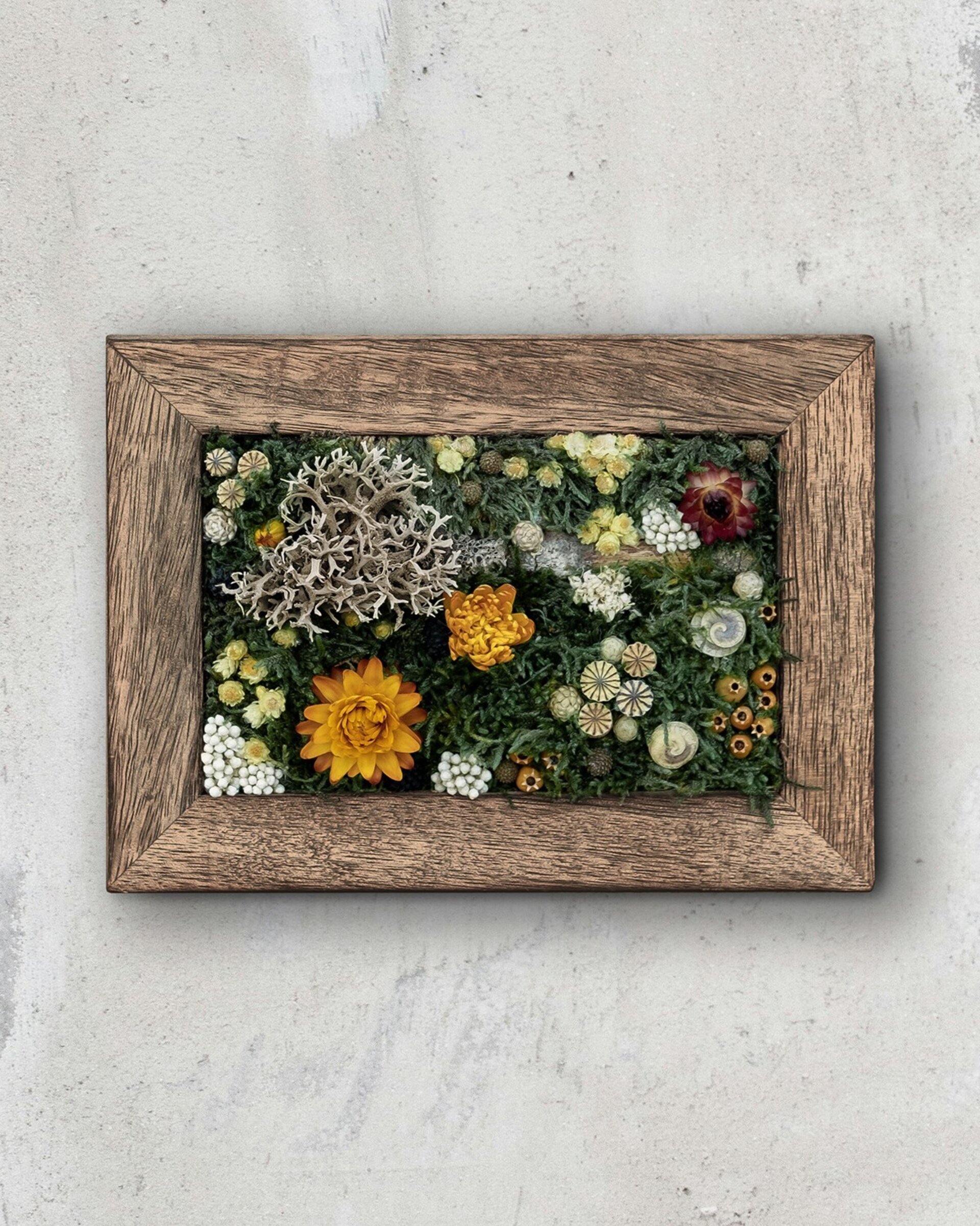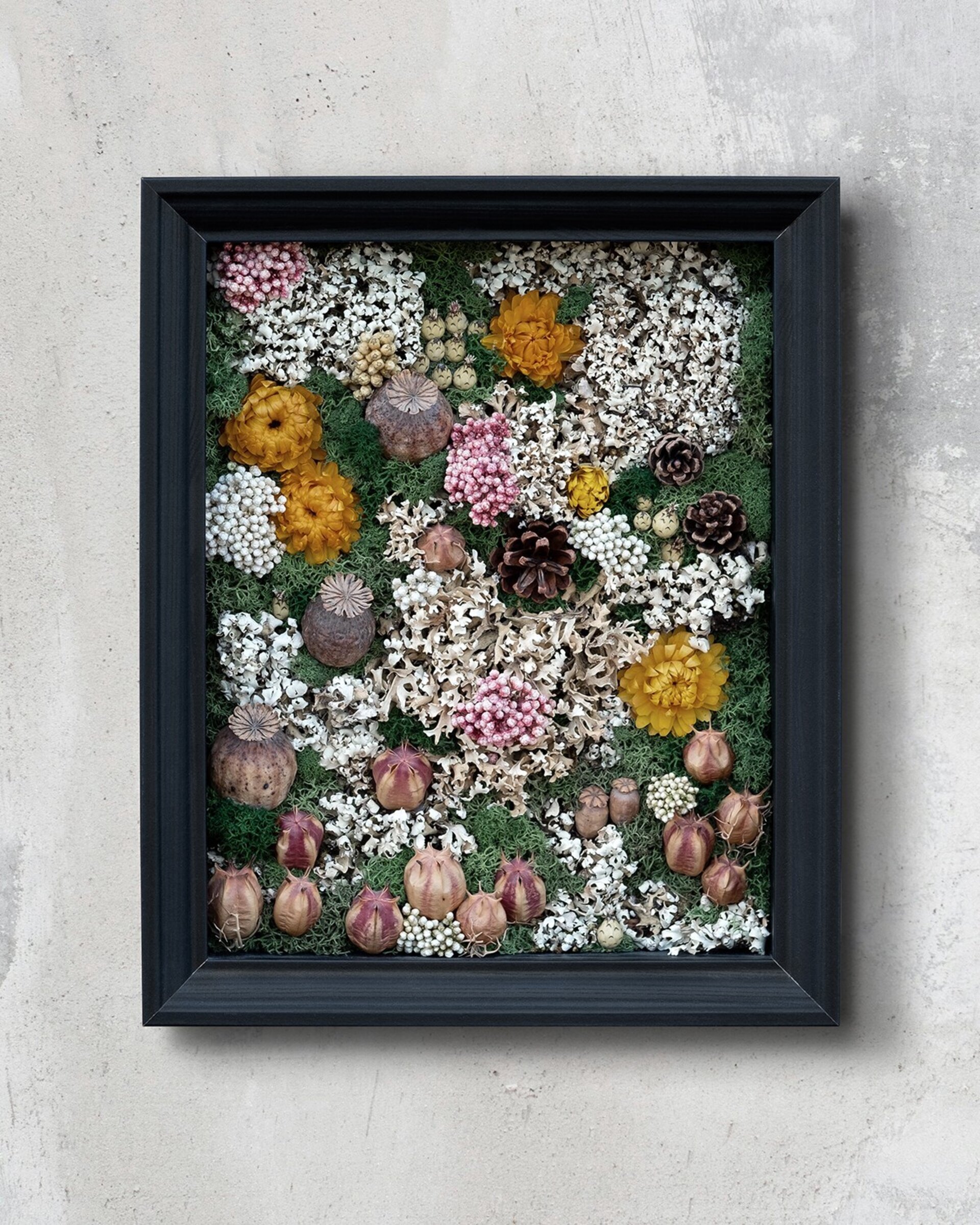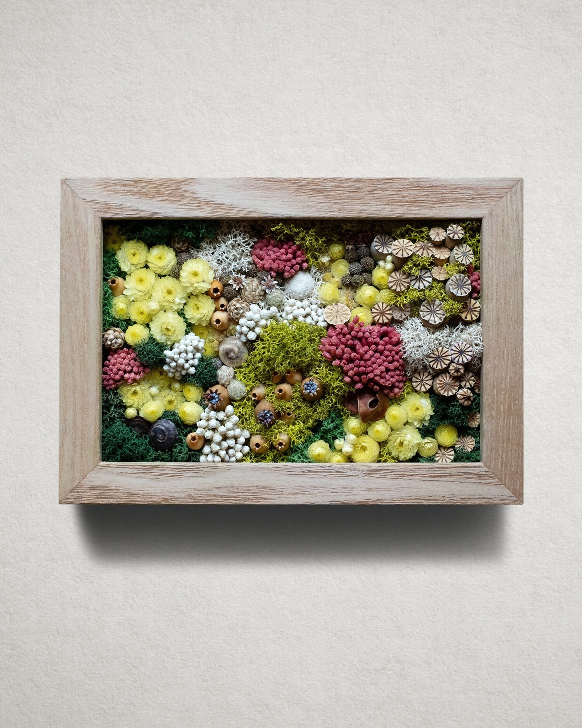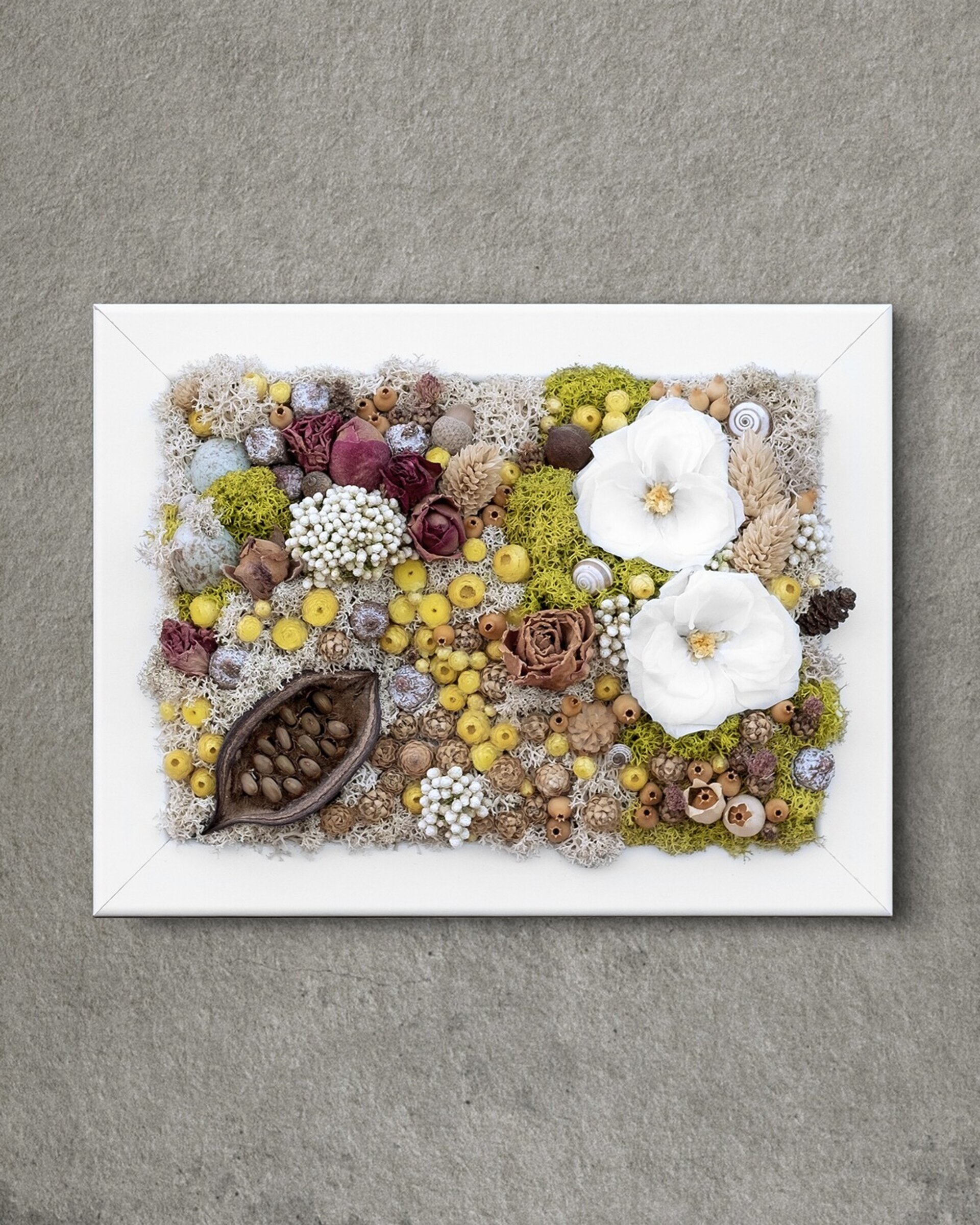 Arte botánico preservado elaborado con materiales naturales tratados para conservar su belleza durante años. Cada pieza es artesanal y exclusiva. Los cuadros planos no requieren cuidados más allá de retirar suavemente el polvo; los de mayor profundidad incluyen protección para mantener intacta la composición.