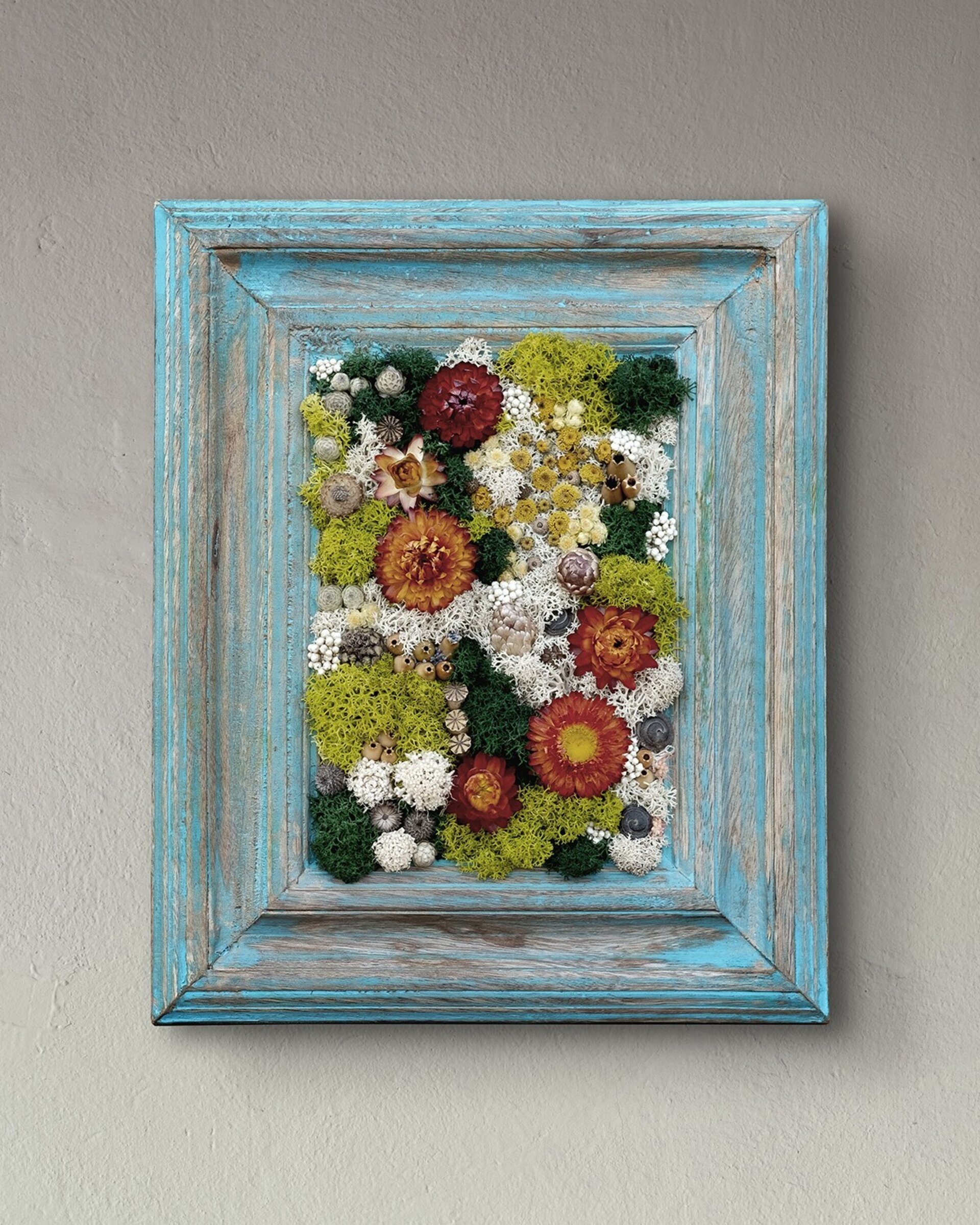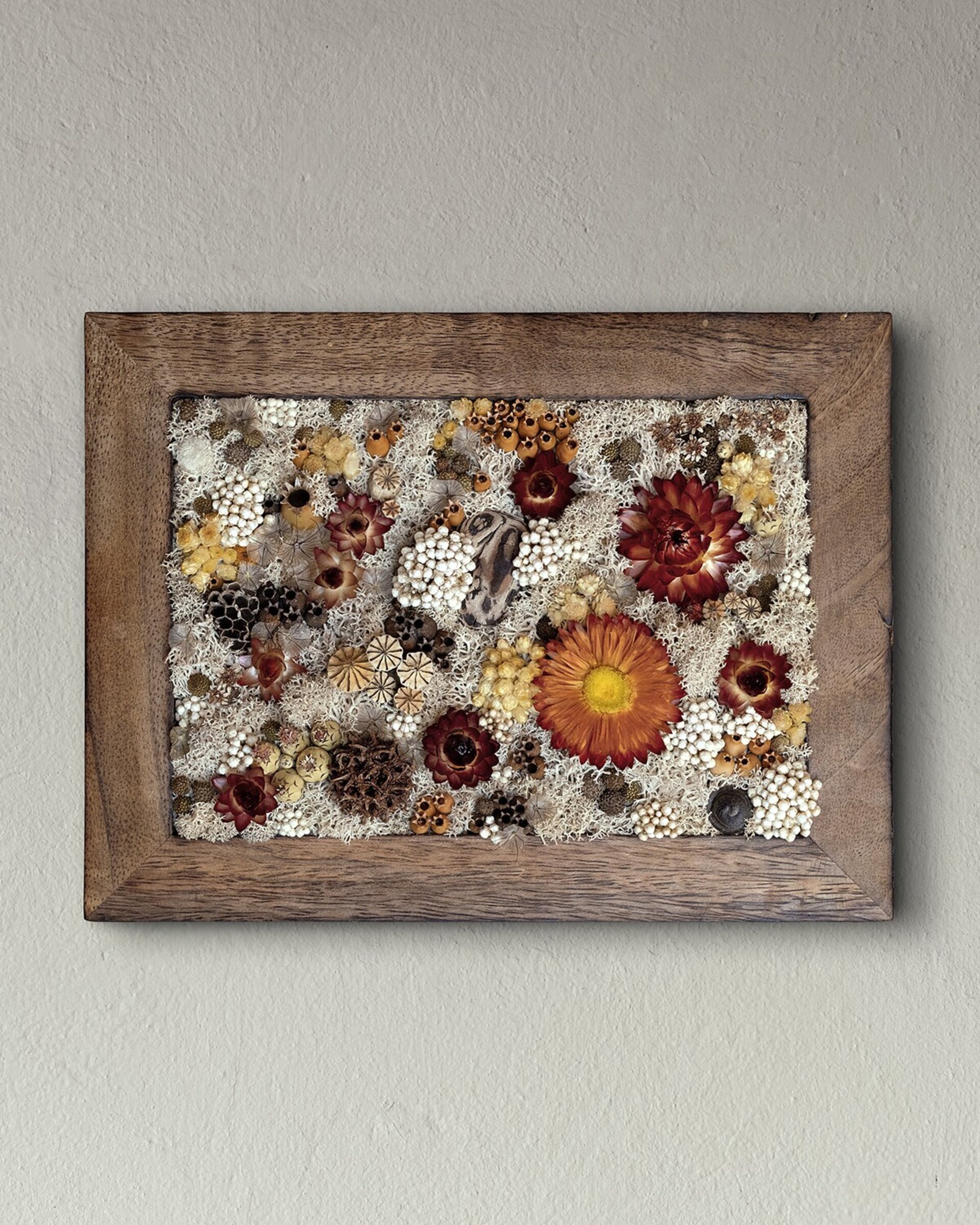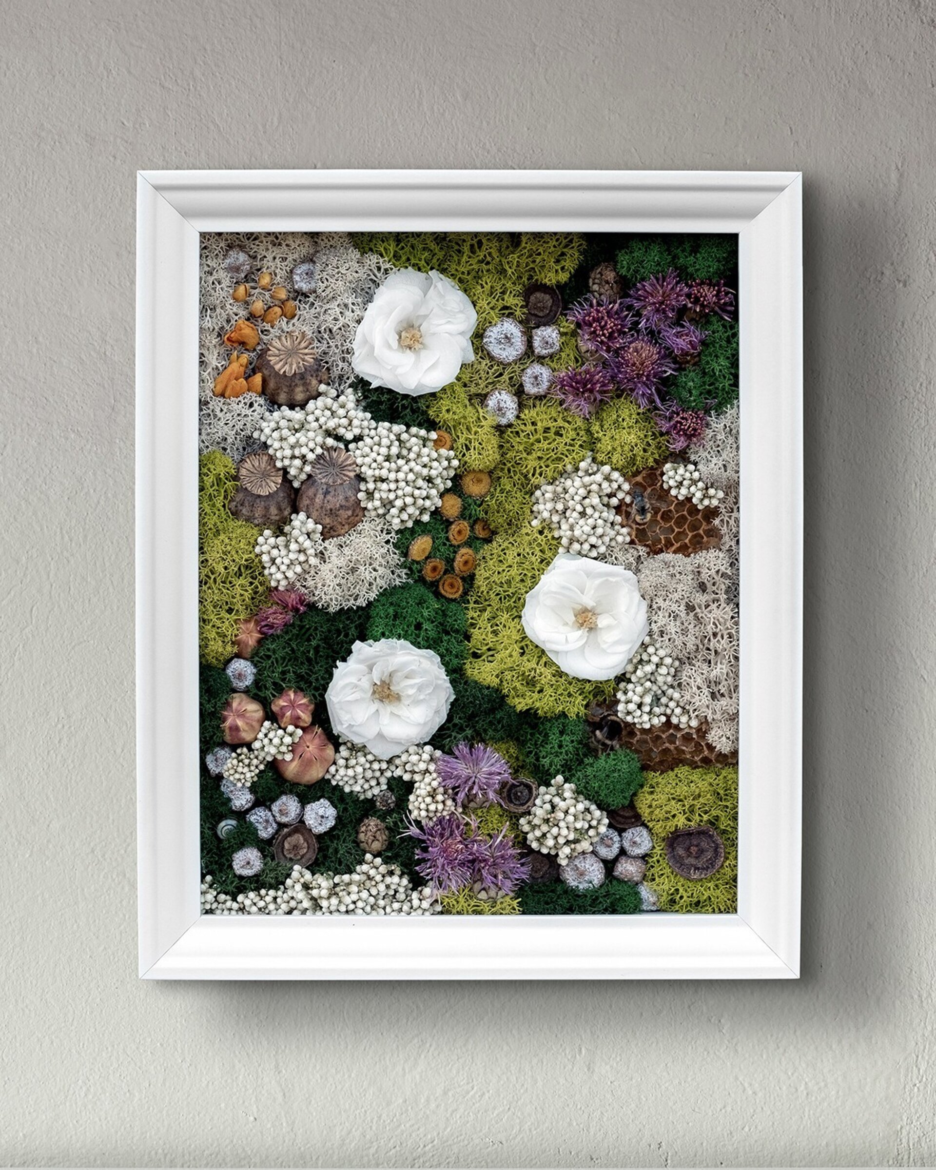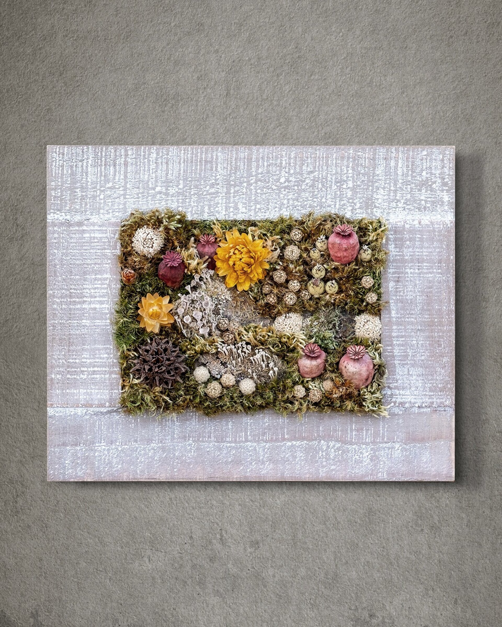 Arte botánico preservado elaborado con materiales naturales tratados para conservar su belleza durante años. Cada pieza es artesanal y exclusiva. Los cuadros planos no requieren cuidados más allá de retirar suavemente el polvo; los de mayor profundidad incluyen protección para mantener intacta la composición.