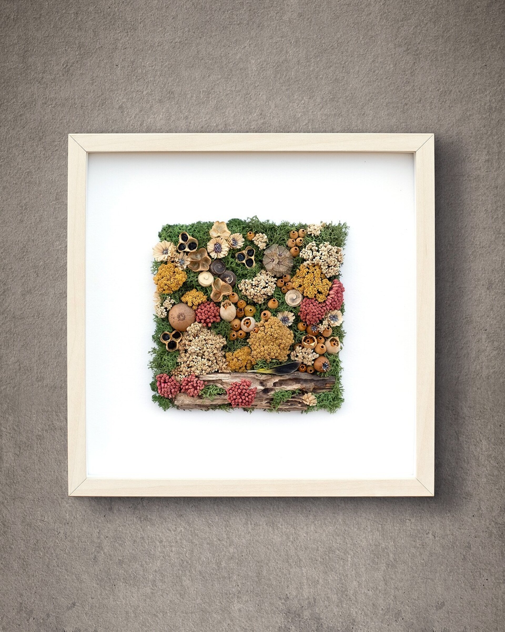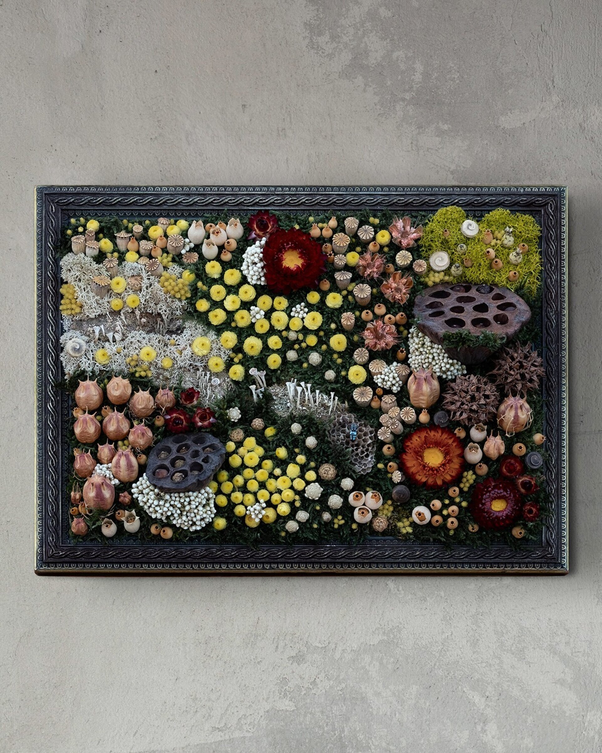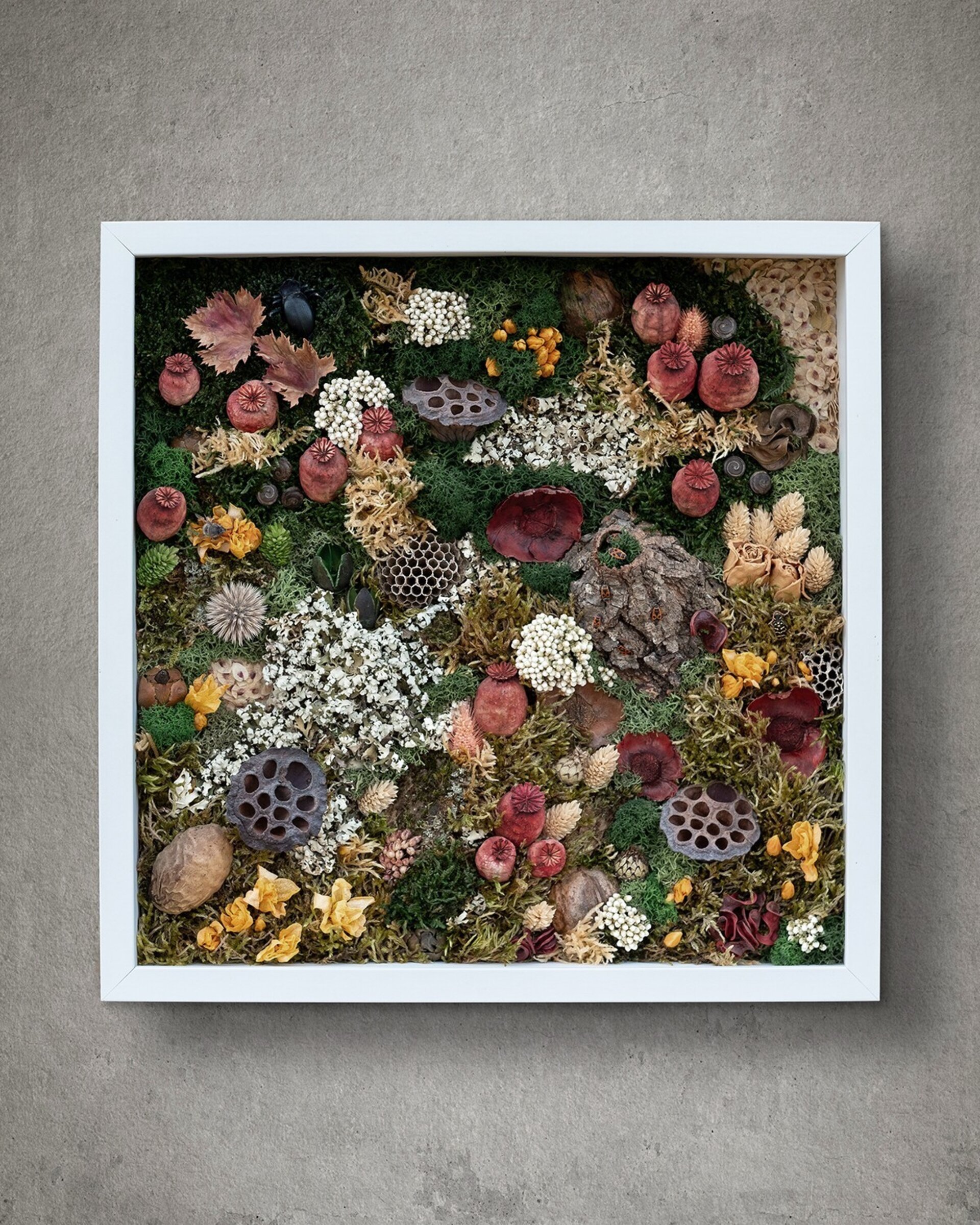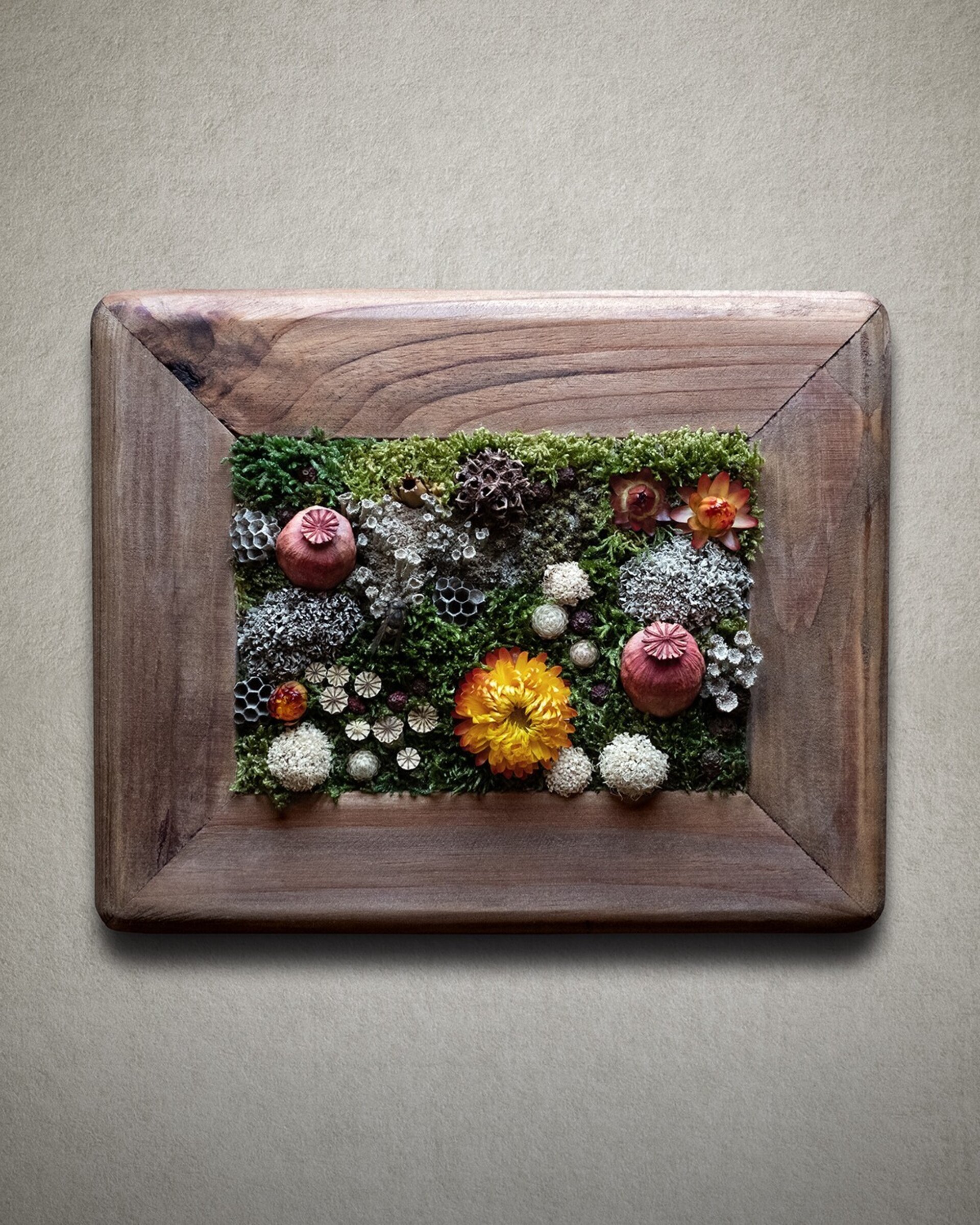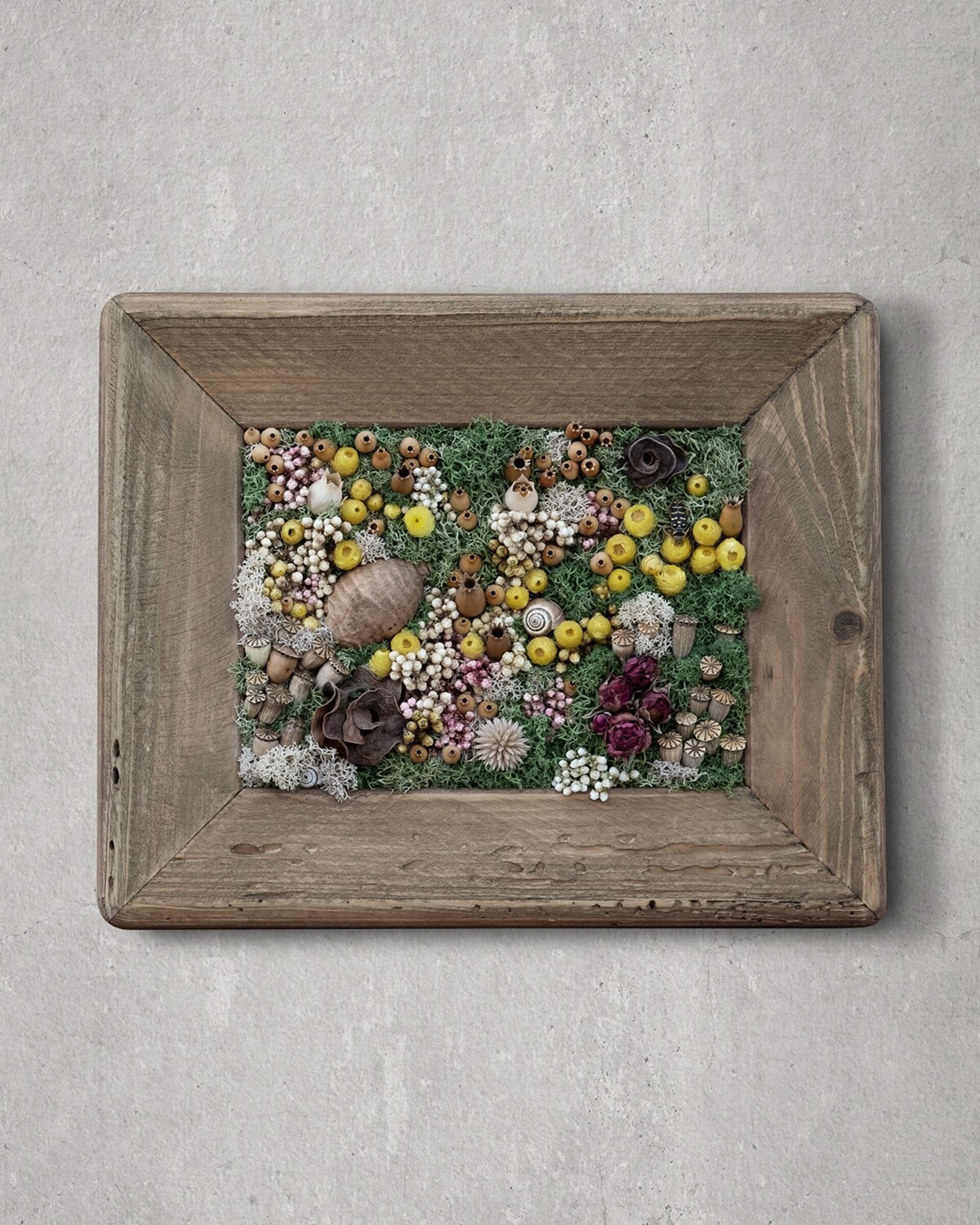 Arte botánico preservado elaborado con materiales naturales tratados para conservar su belleza durante años. Cada pieza es artesanal y exclusiva. Los cuadros planos no requieren cuidados más allá de retirar suavemente el polvo; los de mayor profundidad incluyen protección para mantener intacta la composición.